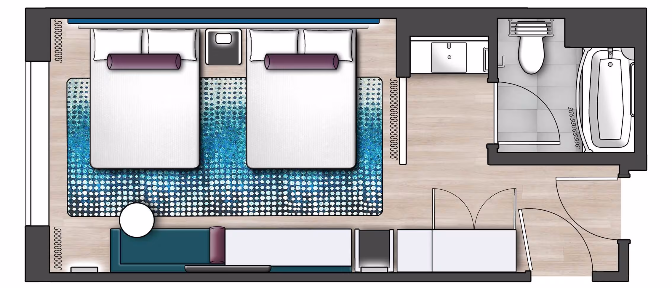 Quartos com curvas expansivas, tons terrestres e uma janela chamativa em estilo de nave espacial, inspiram pensamentos de explorar novos mundos. Destacados em cores suaves com um piso de bom gosto, este quarto de 315 pés quadrados acomoda até quatro pessoas.