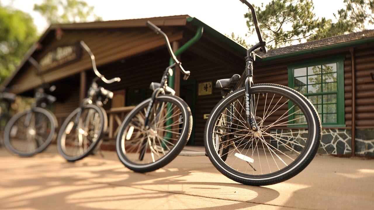 Bicicletas para adultos e crianças (algumas com rodinhas) estão disponíveis por ordem de chegada em locais junto aos seguintes hotéis Resort Disney: