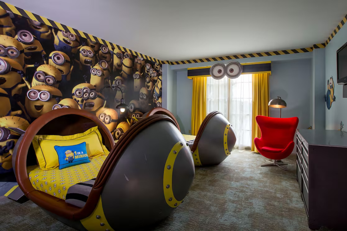Os pais podem ter privacidade em um belo quarto principal, enquanto as crianças se divertem em um quarto conjugado com o tema Meu Malvado Favorito.